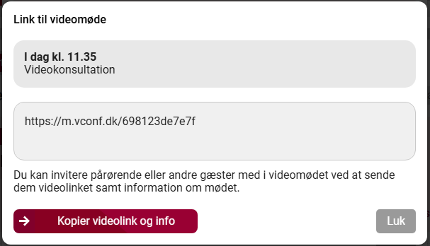 5. Klik på Kopier videolink og info og indsæt teksten i en SMS eller mail til din pårørende.