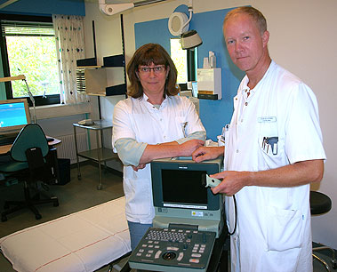 På billedet ses overfysioterapeut Annette Linnet Borch og overlæge Jens Ole Storm med en ultralydscanner, som kan være med til at stille en hurtig diagnose på idrætsklinikken.