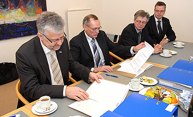 På billedets ses fra venstre Falcks koncernchef Allan Søgaard Larsen, regionsrådsformand Bent Hansen (S), divisionsdirektør Ole Quist Pedersen og regionsdirektør Lars Vester - de to sidstnævnte fra Falck.