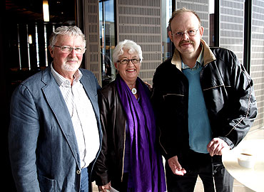 Den mest trofaste regionsråds-tilhører Søren Ellekær Hansen (t.h.) bydes velkommen til mødet af Knud Hammer (S) og Marianne Carøe (S).