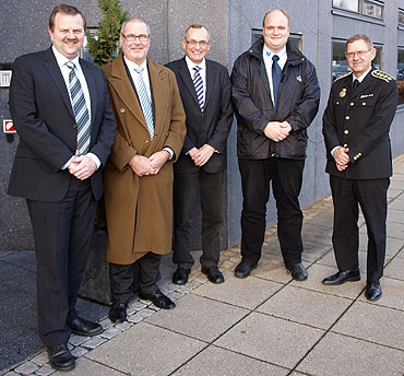 Mændene bag den nye vagt- og ambulancedækning. Fra venstre stationsleder Søren Peter Kjeldahl, Samsø Redningskorps Aps.; regionsdirektør Gunnar Thykjær, Falck Danmark A/S; regionsformand Bent Hansen; redningsdirektør Michael Sørensen, redningsselskabet Responce A/S, og politidirektør Jens Kaasgaard, Midt- og Vestjyllands Politi.