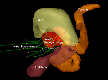 En avanceret 3D MR-skanning viser, hvordan nålene til brachyterapi er placeret i en kræftsvulst i livmoderhalsen, samt hvor de omkringliggende tarme og blæren er placeret. Et særligt apparat programmeres til at styre strålekilderne rundt i nålene, så hele svulsten bestråles, mens de omgivende organer skånes mest muligt.